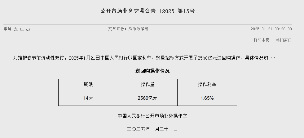 2025-01-21 09:36:02 25 0 - N + 央行今日开展2560亿元14天期逆回购操作 1月21日金融一线消息,据央行公告,为维护春节前流动性充裕,2025年1月21日中国人民银行以固定利率、数量招标方式开展了2560亿元逆回购操作。 返回列表 上一篇:光大期货:1月21日矿钢煤焦日报 下一篇:源自热爱:互相映照的企业家精神与上海城市精神 相关文章 快讯:现货白银日内大跌4.00%,现报85.61美元/盎司 中芯国际、小米集团-W双双跌逾4%,港股信息技术ETF(159131)午后跌幅扩大至4%,实时净申购增至1000万份! 男子为报复前女友群发其裸照,法院判了 2025年新晋13个“千亿县”,谁在上榜?谁在掉队? 发表评论取消回复中国互联网举报中心 快捷回复: 评论列表 (暂无评论,共25人参与)参与讨论 还没有评论,来说两句吧...