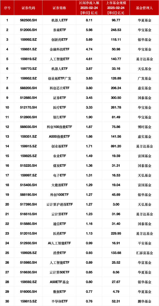 2025-02-25 09:34:01 26 0 - N + 最受青睐ETF:2月24日华夏机器人ETF获资金净申购8.11亿元,华宝券商ETF获资金净申购5.98亿元 Wind数据显示,2月24日,华夏ETF获资金净申购8.11亿元,华宝券商ETF获资金净申购5.98亿元,银华创新药ETF获资金净申购5.69亿元。一图看懂昨日股票ETF净申购TOP30排行榜>> 返回列表 上一篇:最受青睐ETF:2月24日天弘云计算沪港深ETF净流入额占比增42.34%,广发粮食50ETF净流入额占比增30.66% 下一篇:美乌矿产协议要定了?特朗普:很快与泽连斯基会面,最快本周签! 相关文章 酒价内参3月3日价格发布:青花郎跌幅居前,大幅回落18元/瓶 江山壮阔万象新——习近平总书记引领中国式现代化新征程 中播数据:供股获超额认购4.68% 国内期货主力合约涨多跌少 SC原油涨超11% 发表评论取消回复中国互联网举报中心 快捷回复: 评论列表 (暂无评论,共26人参与)参与讨论 还没有评论,来说两句吧...