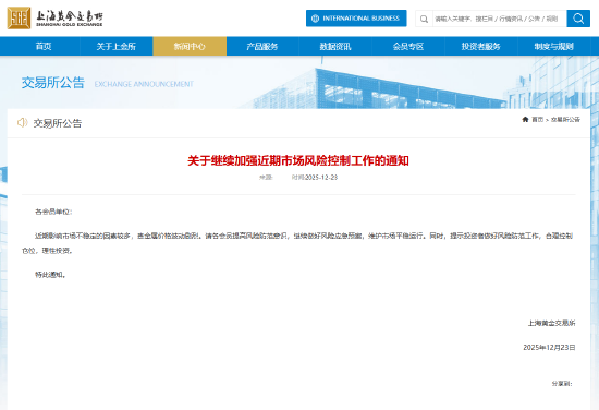 12月23日,上海黄金交易所发布《关于继续加强近期市场风险控制工作的通知》,提示各会员单位:近期影响市场不稳定的因素较多,贵金属价格波动剧烈。请各会员提高风险防范意识,继续做好风险应急预案,维护市场平稳运行。同时,提示投资者做好风险防范工作,合理控制仓位,理性投资。