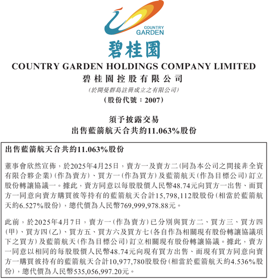 2025年4月,碧桂园(02007.HK)公告称,将所持蓝箭航天11.063%的股份作价约13.05亿元出售。
