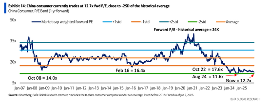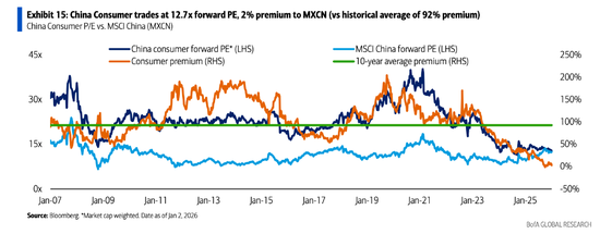 美银数据显示,自2023年底以来,MSCI中国指数估值已从9.3倍前瞻市盈率提升至12.4倍,而同期中国消费板块(港股)的估值则从14.2倍回落至12.7倍。这一变化导致消费板块相对MSCI中国指数长达十年的平均估值溢价(约92%)几乎完全消失。