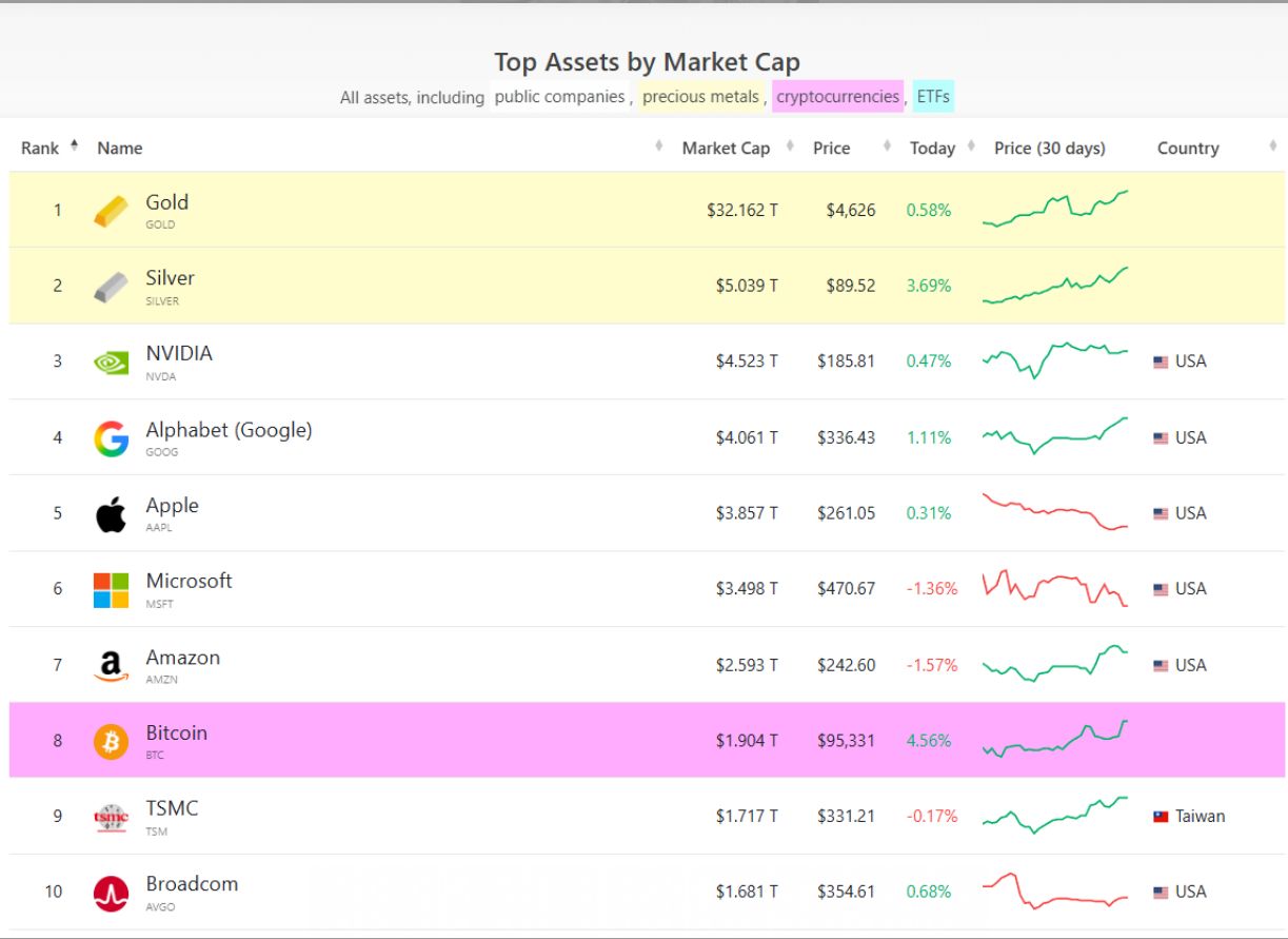 值得注意的是,受银价提振,白银总市值首次站上5万亿美元大关,已超越英伟达成为全球第二大资产。根据市值数据平台CompaniesMarketCap的数据,目前白银市值为5.039万亿美元;黄金以32.162万亿美元的市值位居榜首,芯片巨头英伟达以4.523万亿美元的市值滑落至第三。前十名榜单如下:
