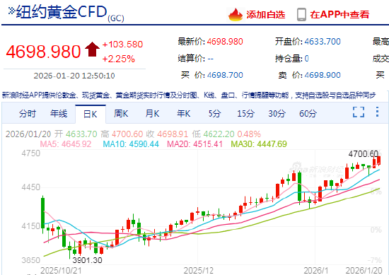 2026-01-20 12:52:02 2 0 - N + 快讯:纽约期金向上触及4700美元/盎司 热点栏目 快讯:2026年1月20日,纽约期金向上触及4700美元/盎司,日内涨2.28%。现货黄金现报4692.9美元/盎司。 新浪合作大平台期货开户 安全快捷有保障 返回列表 上一篇:机构:在当前情况下 美国国债的避险功能可能失灵 下一篇:A股融资保证金比例下调首日:买入金额下降20.35%,热门股分歧显现 相关文章 华为杨超斌:5G-A已经成为必然选择,6G标准化工作已正式启动 中东局势搅动市场,除了碳酸锂大跌还有哪些期货回调了? 西班牙不让美国使用空军基地炸伊朗 特朗普下令斩断两国贸易往来 伊朗战火延烧中东全境 美国或考虑从内部瓦解德黑兰 发表评论取消回复中国互联网举报中心 快捷回复: 评论列表 (暂无评论,共2人参与)参与讨论 还没有评论,来说两句吧...