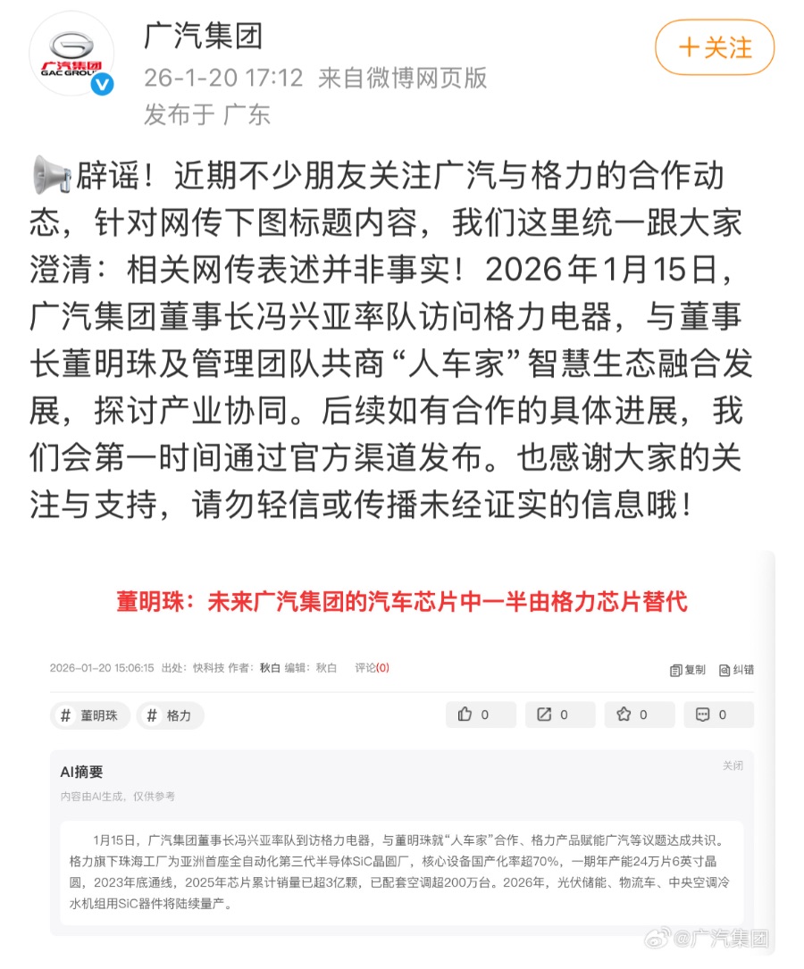 对此,1月20日,广汽集团官方微博发文辟谣,称近期不少朋友关注广汽与格力的合作动态,网传“未来广汽的汽车芯片中一半由格力产品替代”,相关表述并非事实。