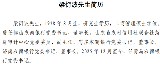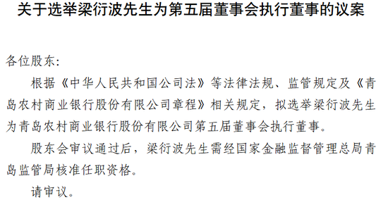近日,青岛农商行发布公告,提名47岁的梁衍波为第五届董事会执行董事候选人。