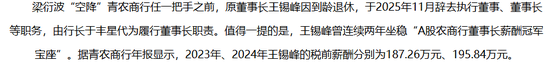 此外,青岛农商行还面临董事长薪酬水平与股价长期表现不匹配的质疑。原董事长王锡峰曾连续两年坐稳“A股农商行董事长薪酬冠军宝座”,2023年、2024年的税前薪酬分别为187.26万元、195.84万元,但与此同时,该行股价长期低迷,未能形成“薪酬与价值”的正向匹配。