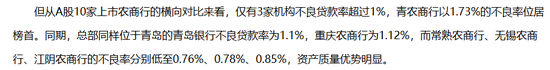 尽管青岛农商行不良贷款率呈连续下降趋势,但从同业对比看,该行1.73%的不良率在A股10家上市农商行中高居首位。
