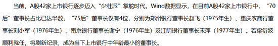若梁衍波的任职资格获得监管核准,他将以47岁的年龄刷新A股上市银行董事长的年龄纪录。据Wind数据显示,目前A股42家上市银行中,“70后”董事长占比已达半数,但“75后”仅有4位,梁衍波比现任最年轻的董事长宋萍(1977年生)还要年轻一岁。