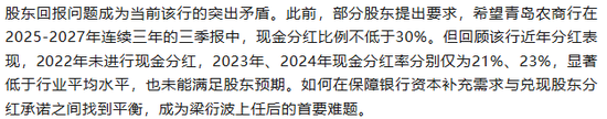 据《华中不良资产》报道,部分股东此前提出要求,希望青岛农商行在2025-2027年连续三年的三季报中,现金分红比例不低于30%。但回顾该行近年分红表现,2022年未进行现金分红,2023年、2024年现金分红率分别仅为21%、23%,显著低于行业平均水平。