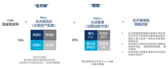 因为缺工具、缺杠杆,国产全天候本质是戴着镣铐跳舞,左边的全天候组合四象限更多是分散资产、降低波动的作用,要做出差异更依赖于右边主动管理部分的表达。