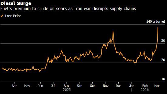 全球柴油价格飙升至多年高位,针对伊朗的战争在中东地区蔓延,导致本就供应趋紧的市场面临更大压力。