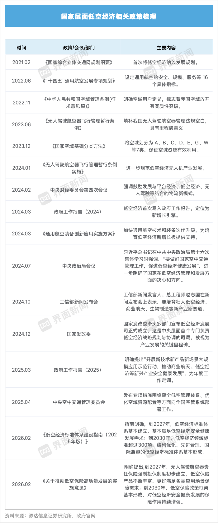 2026年2月,市场监管总局会同中央空管办、国家发展改革委等十部门联合印发了《低空经济标准体系建设指南(2025年版)》,明确到2027年,低空经济标准体系基本建立,基本满足低空经济安全健康发展需求;到2030年,低空经济领域标准超过300项 ,结构优化、先进合理、国际兼容的低空经济标准体系基本形成。