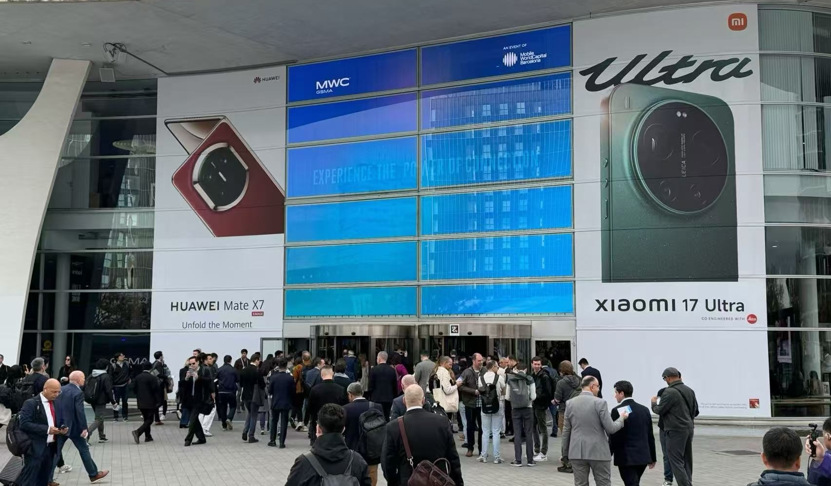 每个踏进MWC场馆的观众,都会对门口的两张巨大海报印象深刻:一张是华为Mate X7,一张是小米 17 Ultra,分别代表两家中国“顶流”手机厂商当前力推的高端机型。