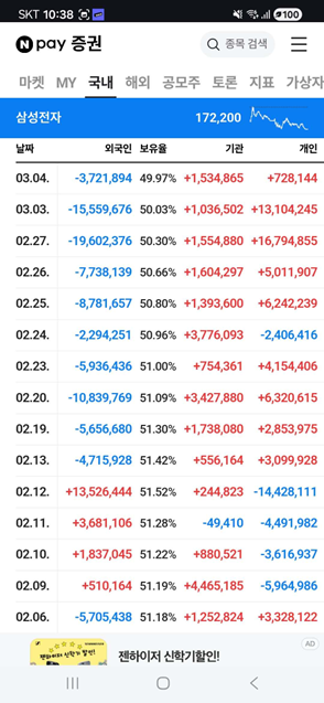 以三星电子为例,韩国资深股民尹度然向《每日经济新闻》记者(以下简称每经记者)展示了一张图,该图显示,2月13日以来,外资持续减仓三星电子,韩国散户则在大规模接盘,机构资金相对中性。