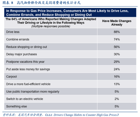 2022年3-7月美国汽油零售价突破4美金接近5美金/加仑,在同年7月的调查中显示,自3月以来,64%的受访者已实际改变了驾驶习惯或生活方式,比如减少开车(首要选择)、合并繁琐出行、减少购物/餐饮等。