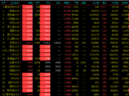 2026年3月9日,早盘开盘,国内期货主力合约涨多跌少,集运欧线、SC、、(LU)、纯苯、、BR、液化气、、瓶片、0>、、油、、、聚丙烯封涨停,涨超7%。