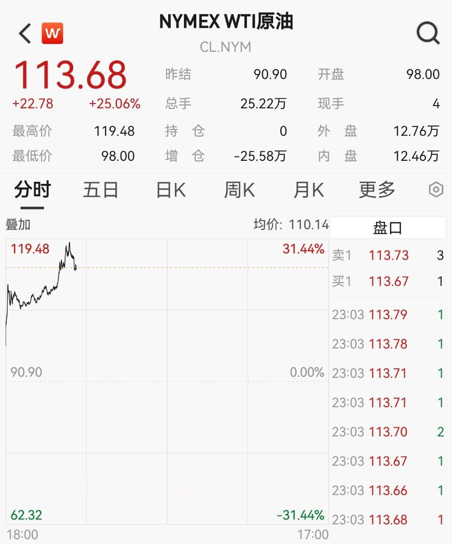 3月9日,国际油价迎来历史性暴涨,WTI原油盘中涨超31%,一度突破119美元/桶。