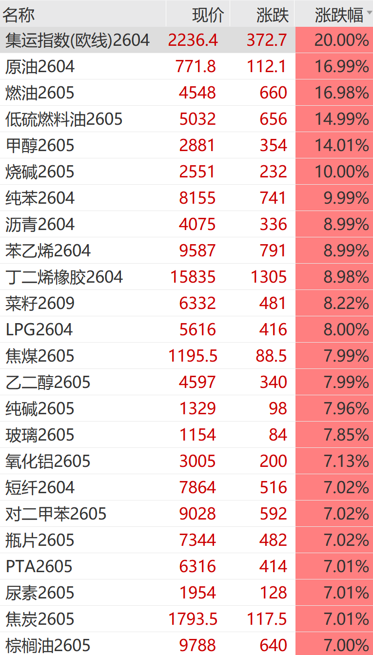 大宗商品市场迎来罕见“涨停潮”:集运欧线、原油、燃料油、低硫燃料油、甲醇、烧碱、纯苯、苯乙烯、沥青、橡胶、液化气、焦煤、乙二醇、瓶片、短纤、对二甲苯、PTA、尿素、棕榈油、菜油、丙烯、PVC、塑料、聚丙烯等近30个品种集体封涨停。