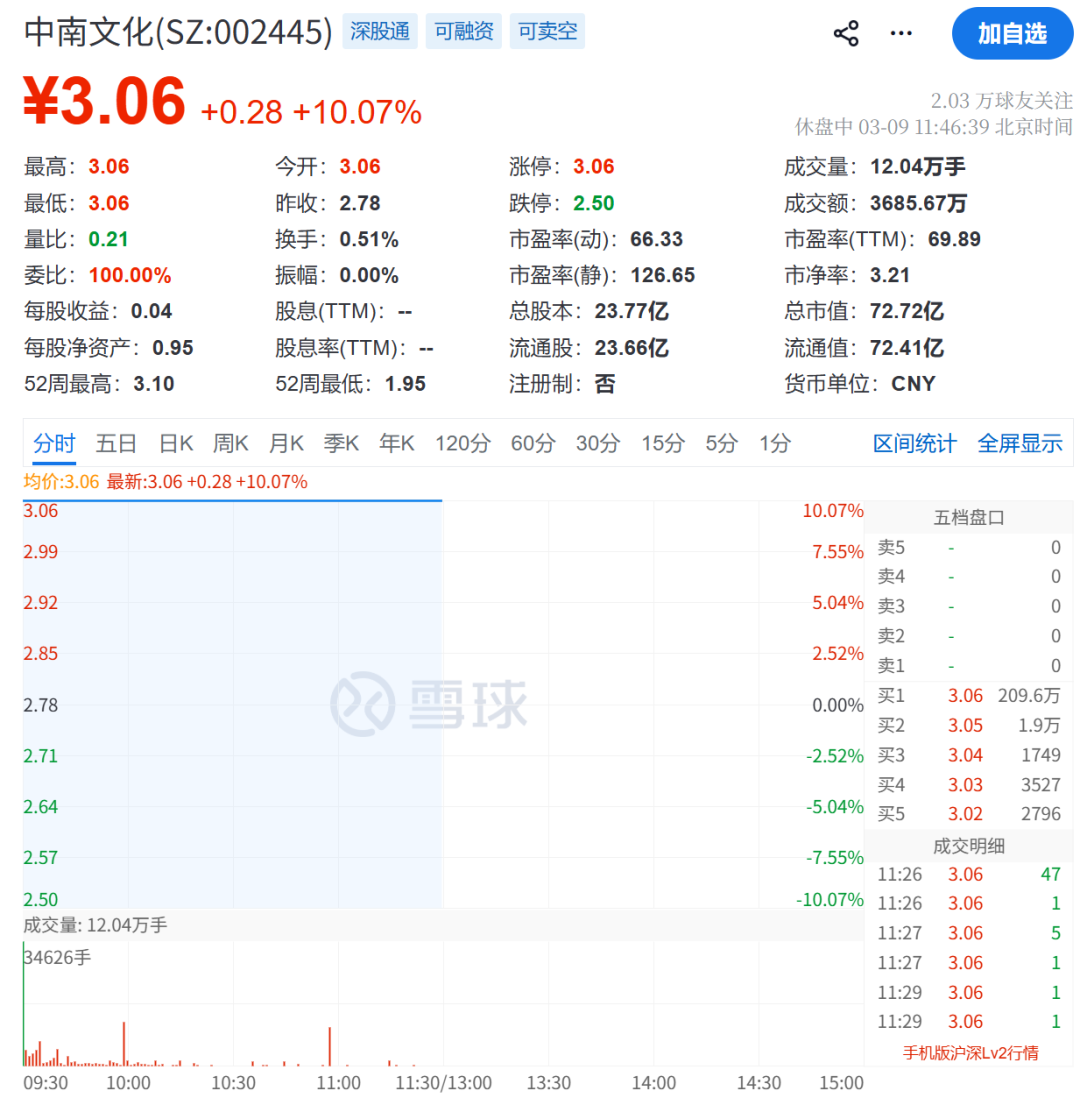 3月9日,中南文化复牌后报3.06元/股,涨幅为10.07%。截至午间收盘,中南文化保持一字涨停状态,买一席位超209万手。