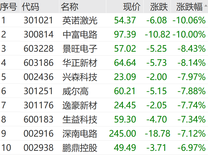 电路板指数走低,跌超10%,、跌超8%,、跌超7%。