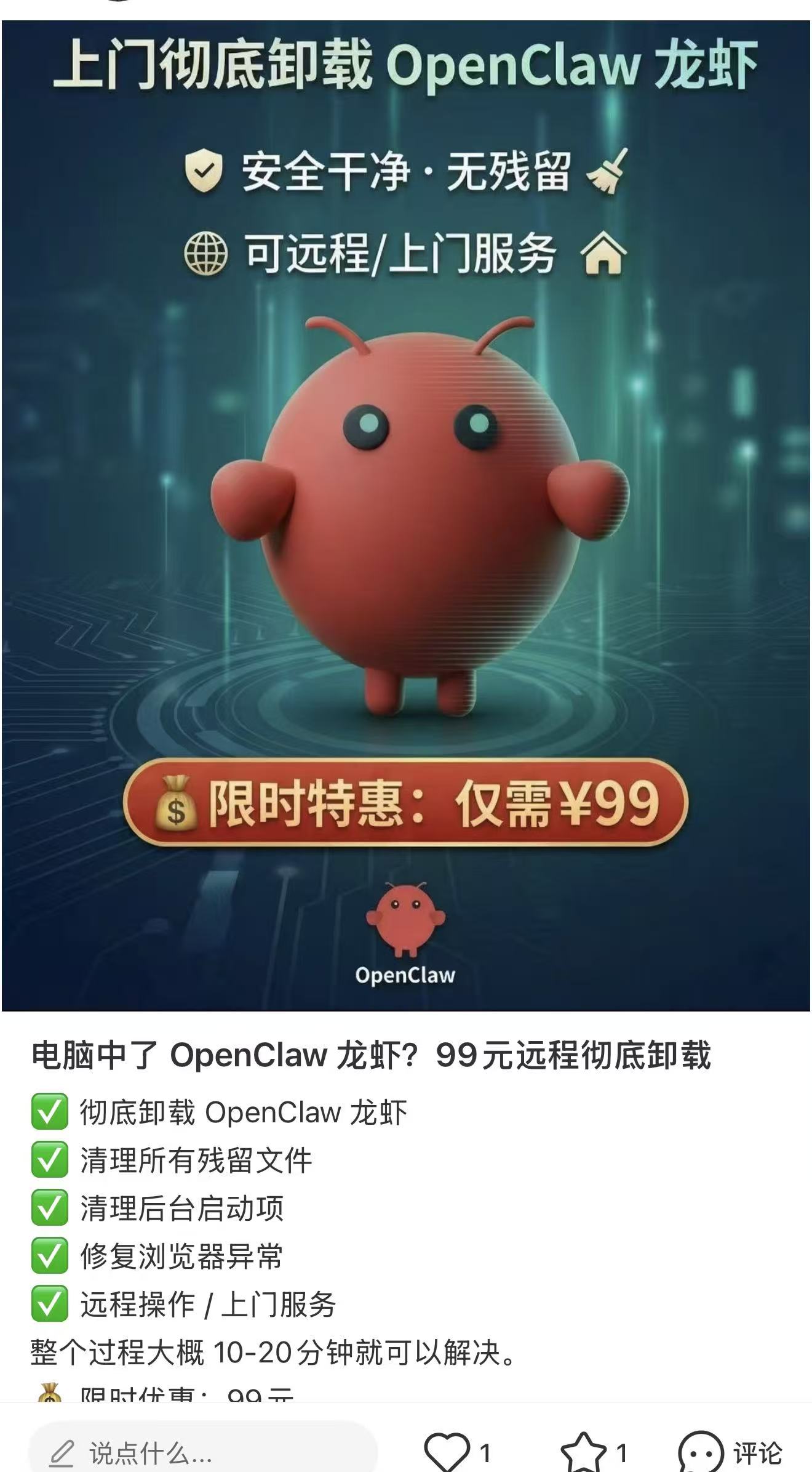 一位提供龙虾卸载远程开发服务的网友写道:“包邮80元,计算机博士生远程操作,Mac、Windows、Linux,不闲聊,有需求下单弄不好不收钱。”另一位小红书的网友写道:“限时特惠:仅需99元,承诺彻底卸载OpenClaw龙虾,清理所有残留文件,清理后台启动项,修复浏览器正常,提供远程操作或上门服务,整个过程大概需要10到20分钟。”