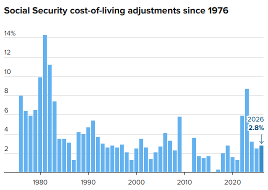 2026 年,约 7500 万社会保障金及补充保障收入受益人获得了 **2.8%** 的 COLA 涨幅。美国社会保障局 10 月表示,这使退休福利平均每月增加 56 美元。不过,具体涨幅会有差异,尤其是受医疗保险 B 部分保费年度上涨影响,该保费通常从月度福利金中扣除。
