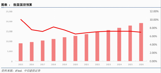 根据日前发布的2026年中央和地方财政预算草案报告,2026年我国国防支出为19095.61亿元人民币,同比增长7%。证券预计,十五五期间我国国防预算仍将保持 7-7.5%左右的稳定增长,占 GDP 比重或有一定提升空间。