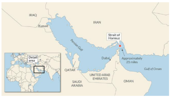 霍尔木兹海峡是波斯湾通往印度洋的唯一海道。该海峡东西长150千米,南北宽64-97千米,最窄处仅48.3千米,它连接波斯湾、阿曼湾和阿拉伯海,并进一步通往印度洋。虽然霍尔木兹海峡并不宽敞,却承担近三分之一的全球海运原油和五分之一的液化天然气运输。