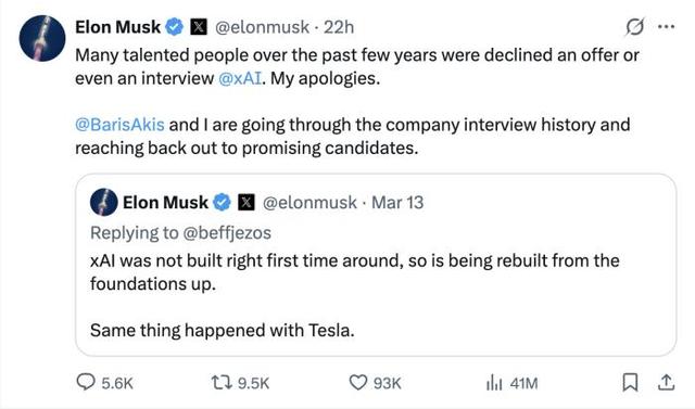“过去几年里,许多有才华的人在申请加入xAI时被拒绝录用,甚至连面试机会都没有获得。对此我深表歉意。”马斯克在X平台上发文表示。