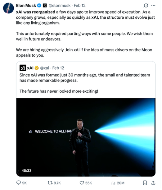 10天后,xAI发布视频阐述公司未来愿景,马斯克转发并补充道:“为了提升执行效率,xAI几天前进行了重组。随着公司的发展,尤其像xAI这样快速成长的公司,其组织结构也必须像任何生物体一样不断演进。遗憾的是,这意味着我们不得不与一些人分道扬镳。”