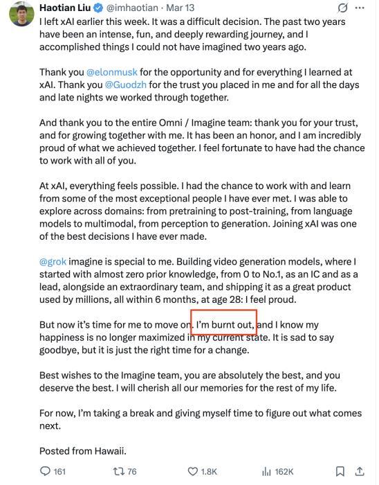 3月13日,负责图像生成产品的创始成员张国栋发帖宣布离开公司。随后,另一名联合创始人刘浩天也在社交媒体上发文,确认早前自己也已离职,并直言“燃尽了”。