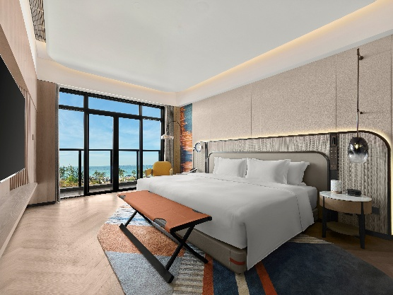 新开业的酒店拥有236间客房及套房,多数房间配备阳台,可面向海景或园景。部分客房设置泳池直通设计,以增强度假体验。酒店公共区域采用开放式社交空间布局,将前台、酒廊及共享工作区域连接在一起,以适应度假客群在休闲与社交之间自由切换的需求。
