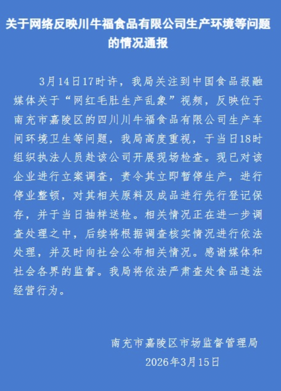 3月15日,四川南充市嘉陵区市场监督管理局发布情况通报称,3月14日18时,该局组织执法人员赴涉事毛肚产品加工企业四川川牛福食品有限公司开展现场检查。现已对该企业进行立案调查,责令其立即暂停生产,进行停业整顿,对其相关原料及成品进行先行登记保存,并于当日抽样送检。相关情况正在进一步调查处理之中。