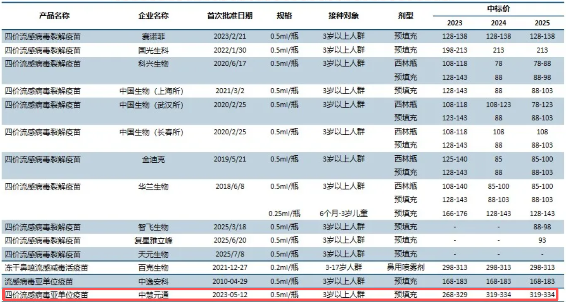 从本次的合作双方来看,中慧元通成立于2015年,2025年8月在港股上市,是一家相对年轻的公司。其核心产品为四价流感病毒亚单位疫苗和冻干人用狂犬病疫苗(人二倍体细胞)。前者于2023年获批上市,目前是国内唯一获批的全人群全剂量四价流感病毒亚单位疫苗。