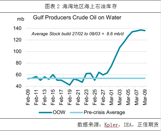 应对方式上,国际能源署成员国于3月11日一致同意,从其战略储备中向市场释放4亿桶石油,以应对中东战争引发的供应中断。IEA认为这为供应冲击提供了很好的缓冲,但在冲突未能迅速解决的情况下,仍然是一种权宜之计。冲突对石油、天然气市场以及经济的最终影响,不仅取决于军事攻击的强度和能源资产的任何损害,还关键取决于通过霍尔木兹海峡航运中断的持续时间。另外,自2月28日之后,海湾地区海上石油库存迅速增加,并在3月8日左右达到平台期,总计增加了7800万桶,相当于每日增加860万桶,约等于40艘超大型原油运输船(VLCC)的量,也有助于减缓产量下降的速度。