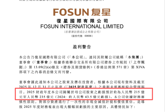 3月6日,复星国际公告预计2025年归母净利润亏损215亿至235亿元,相比2024年43.5亿元的亏损扩大近5倍。这意味着,从单一项目到整个资本平台,压力正在同步显现。