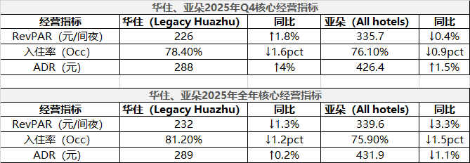 华住与亚朵在单店核心经营指标趋势上呈现一致性。华住集团2025年全年入住率同比下滑约1.2个百分点,RevPAR同比下降约1.3%。亚朵集团2025年全年入住率同比下降约1.5个百分点,RevPAR同比下降约3.3%。
