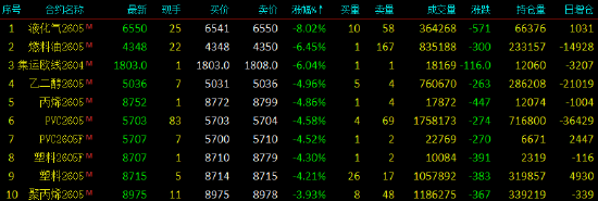 2026年3月25日,国内期货主力合约涨跌互现。(LPG)跌超8%,、集运欧线跌超6%,、、(LU)、丙烯、跌超4%。涨幅方面,沪银涨超7%,铂、钯涨超5%,、涨超4%。