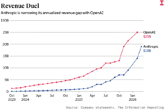上月,OpenAI 年化营收飙升至 250 亿美元,几乎是一年前的四倍。而 Anthropic 的增长速度更快:上月末,其年化营收突破 190 亿美元,约为一年前的 14 倍。如果这一趋势持续,Anthropic 有望在未来一年左右追上 OpenAI,这并非天方夜谭。
