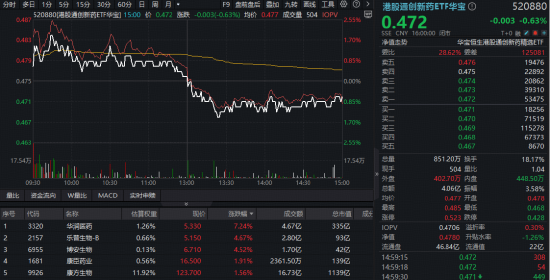 港股通创新药板块韧性凸显,港股通创新药ETF华宝(520880)早盘一度涨近2%,最终收跌0.63%,不过跌幅显著小于大市。成份股华润医药领涨7.24%,乐普生物-B涨4.67%,权重股康方生物涨1.56%。下跌方面,信达生物、石药集团跌逾3.8%,跌近2%。