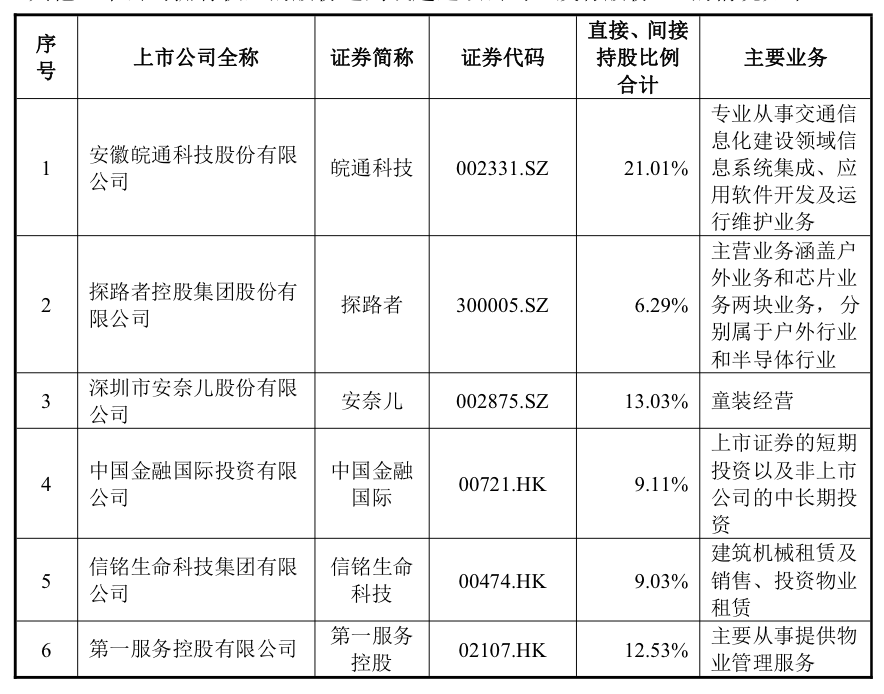 除上述两家公司外,黄涛还持有探路者(300005.SZ)6.29%股权、中国金融国际(00721.HK)9.11%股权、信铭生命科技(00474.HK)9.03%股权、第一服务控股(02107.HK)12.53%股权,以及农银人寿保险股份有限公司11.65%的股份。