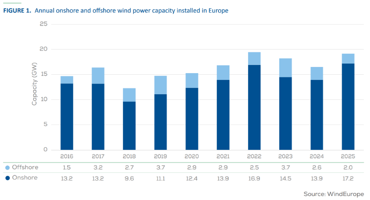 欧洲风能协会年度报告显示,2025年欧洲新增风电装机容量19.1 GW,其中欧盟27国新增15.1 GW,累计总装机达到304 GW,包括265 GW陆上风电和39 GW海上风电。整体来看,去年风电在欧盟27国用电总量中占比约为19%,发电量基本与2024年持平。
