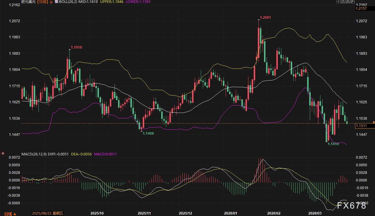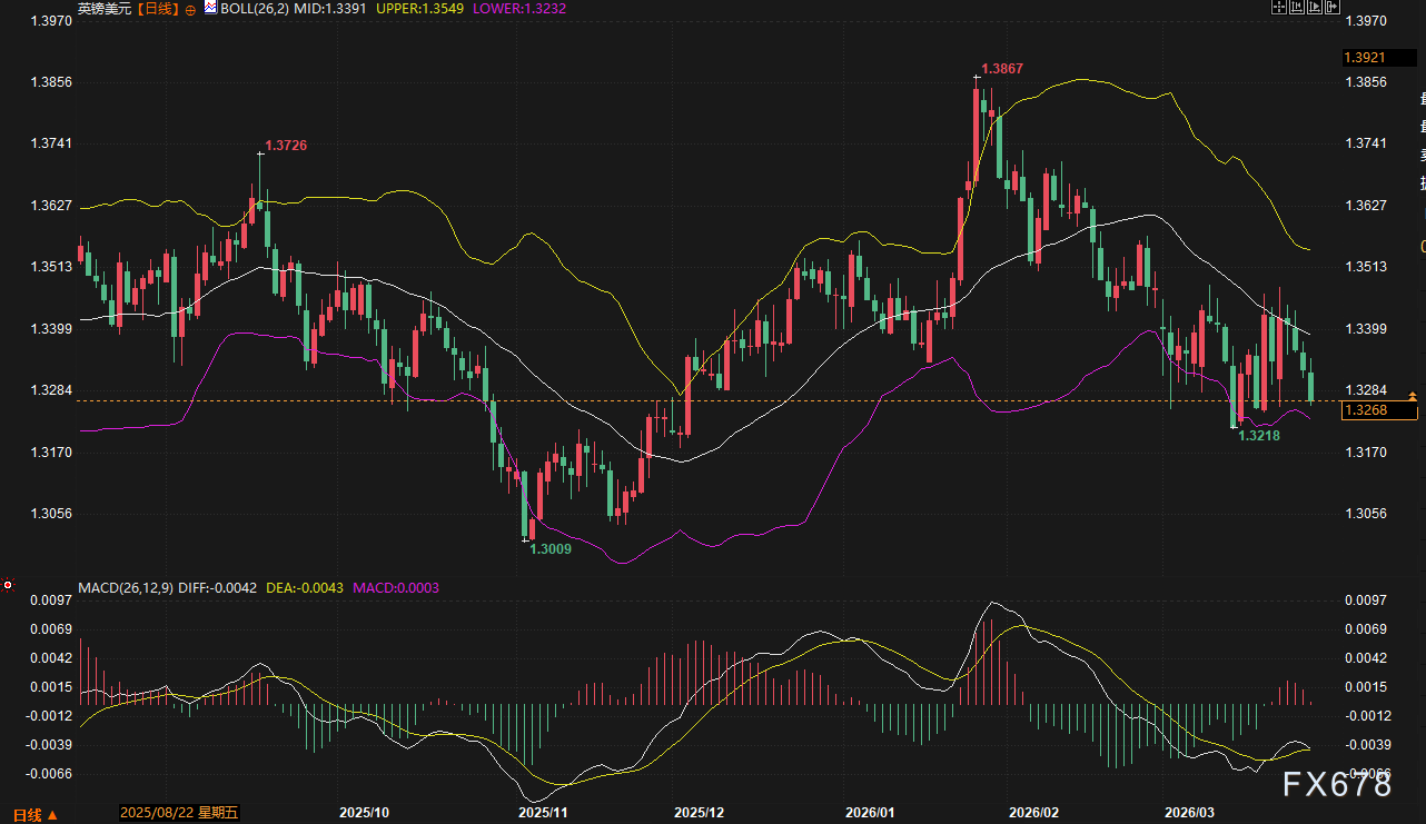 与本周表现疲软。跌破1.1619的布林带中轨,中期下行趋势确立;英镑则连续四个交易日走低,录得0.9%的周跌幅,成为非美货币中表现最差的品种之一。MACD绿柱持续放大,显示空头动能仍在释放过程。