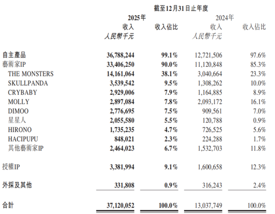 其中,LABUBU所属家族THE MONSTERS贡献141.6亿元的营收,是公司唯一一个百亿级别的大IP,占总营收的比重达到38.1%。