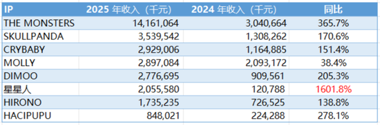 增速方面,最亮眼的是2024年推出的新锐IP——星星人,不到两年时间便斩获20亿营收,实现16倍增长。