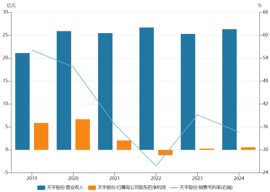 近两年来,天宇股份的业绩表现并不理想。2023年至2024年,归母净利润余额均不足亿元,与2020年的峰值6.67亿元相差甚远。2025年三季报显示,公司营业收入同比增18.36%至22.87亿元,归母净利润同比增159.57%至2.21亿元。