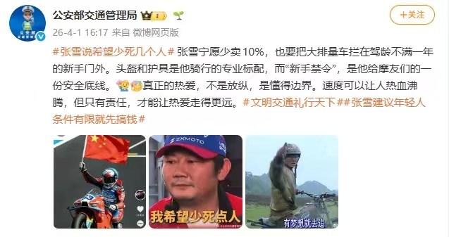 4月1日,公安部交通管理局官方微博发文表示:张雪宁愿少卖10%,也要把大排量车拦在驾龄不满一年的新手门外。头盔和护具是他骑行的专业标配,而“新手禁令”,是他给摩友们的一份安全底线。真正的热爱,不是放纵,是懂得边界。速度可以让人热血沸腾,但只有责任,才能让热爱走得更远。
