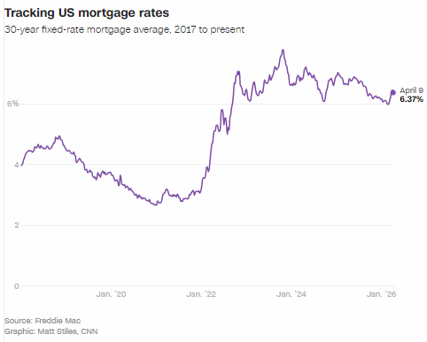 就在几周前,借贷成本还远低于现在。2 月下旬,在美国与以色列联合对伊朗发动打击前两天,30 年期固定抵押贷款平均利率降至 5.98%,为三年多来首次跌破 6%。