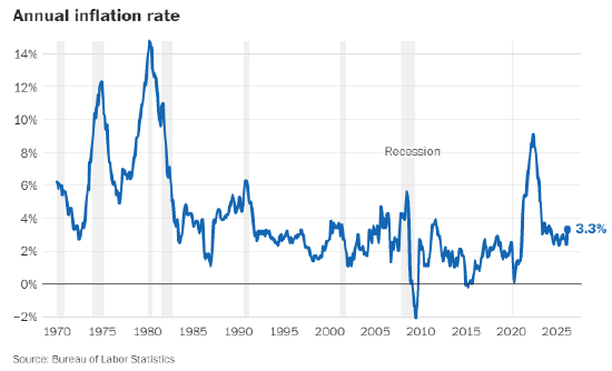 3 月报告出炉之际,通胀已连续五年高于美联储 **2%的目标,回归常态的希望正逐渐消退。即便在伊朗冲突推波助澜之前,物价涨幅从 2022 年峰值明显回落之后,也已在3%** 左右停滞,较美联储目标高出约 1 个百分点。