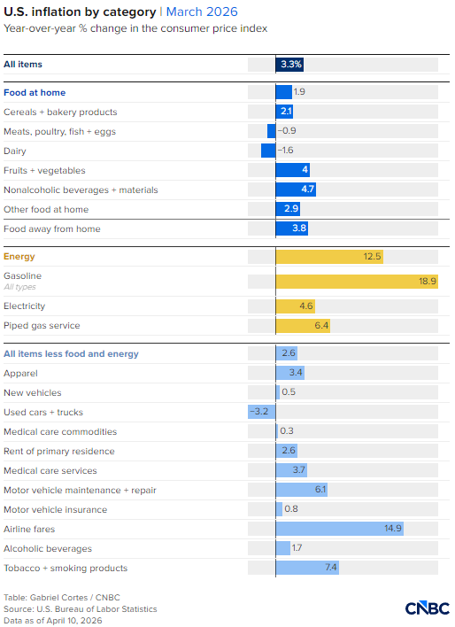 - 美国劳工统计局数据显示,2026 年 3 月消费者价格指数(CPI)同比上涨 3.3%,高于 2 月的 2.4%。